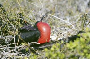 アメリカグンカンドリ 喉袋をパンパンに膨らませたオス。パンパンに膨らませた喉袋とこの美しい赤はメスにとっては魅力的に見えるのだろうエクアドル ガラパゴス諸島 2012年11月