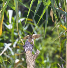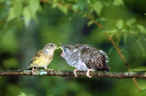 カッコウのひなを育てるオオヨシキリ 7月 山中湖