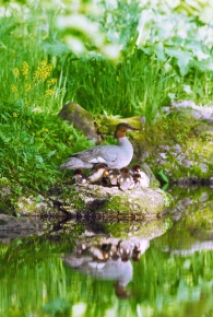 カワアイサ 雌 親子 子どもを背負う 北海道 河東郡 音更町 6月