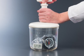 空気を膨張させる実験 気体の性質 断熱膨張 B_3 簡易真空容器に,ビニール袋に気圧計,デジタル温度計を入れ,中の空気を抜く前