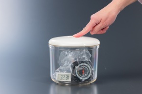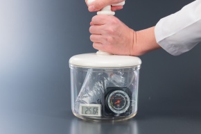 空気を膨張させる実験 気体の性質 断熱膨張 B_5 簡易真空容器に,ビニール袋に気圧計,デジタル温度計を入れ,中の空気を元に戻す