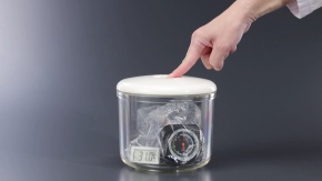 空気を膨張させる実験 気体の性質 断熱膨張 B_2 簡易真空容器に,ビニール袋に気圧計,デジタル温度計を入れる フタをする