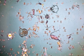 淡水(池)のプランクトン タマミジンコ,アオミドロ,ジュウジケイソウなど 藤沢市で採集 倍率3 画像の長辺12mm 神奈川県 藤沢市 8月