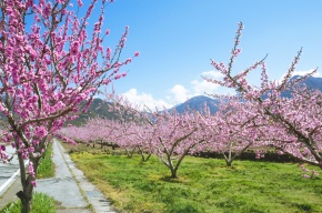 モモ畑 左はハナモモ 山梨県 笛吹市 4月