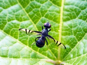 ミスジヒメヒロクチバエ Rivellia nigricans ヒロクチバエ科Platystomatidae (英名)signal fly 口から水滴を出して葉の上で翅をヒラヒラ動かしているところ おそらくメス 日本 Japan 長野県、峰の原高原 林縁、草原 8月