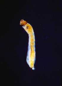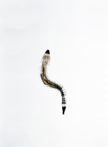 アミカ類 幼虫(昆虫 ハエ目 アミカ科)川の水質の指標生物 きれいな水の指標 倍率2.7 5月 河内川で採集 神奈川県足柄上郡山北町