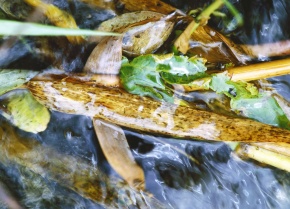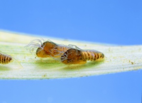 ブユ 幼虫 ヨシの葉に付着(昆虫類 ハエ目 ブユ科)川の水質の指標生物 きれいな川の指標 神奈川県山北町 酒匂川水系 7月 倍率3.5