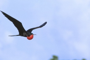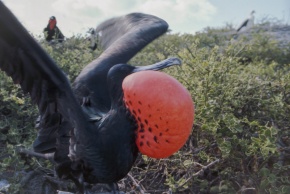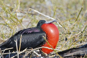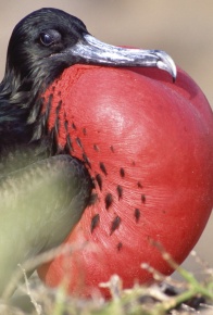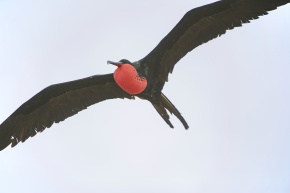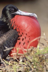 アメリカグンカンドリ 喉袋をパンパンに膨らませたオス。パンパンに膨らませた喉袋とこの美しい赤はメスにとっては魅力的に見えるのだろうエクアドル ガラパゴス諸島 2012年11月