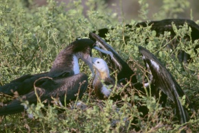 アメリカグンカンドリ 真っ白だった産毛も徐々に生え変わり大きくなった雛に母親が餌を運んで来たのだろう。 エクアドル ガラパゴス諸島 2012年11月