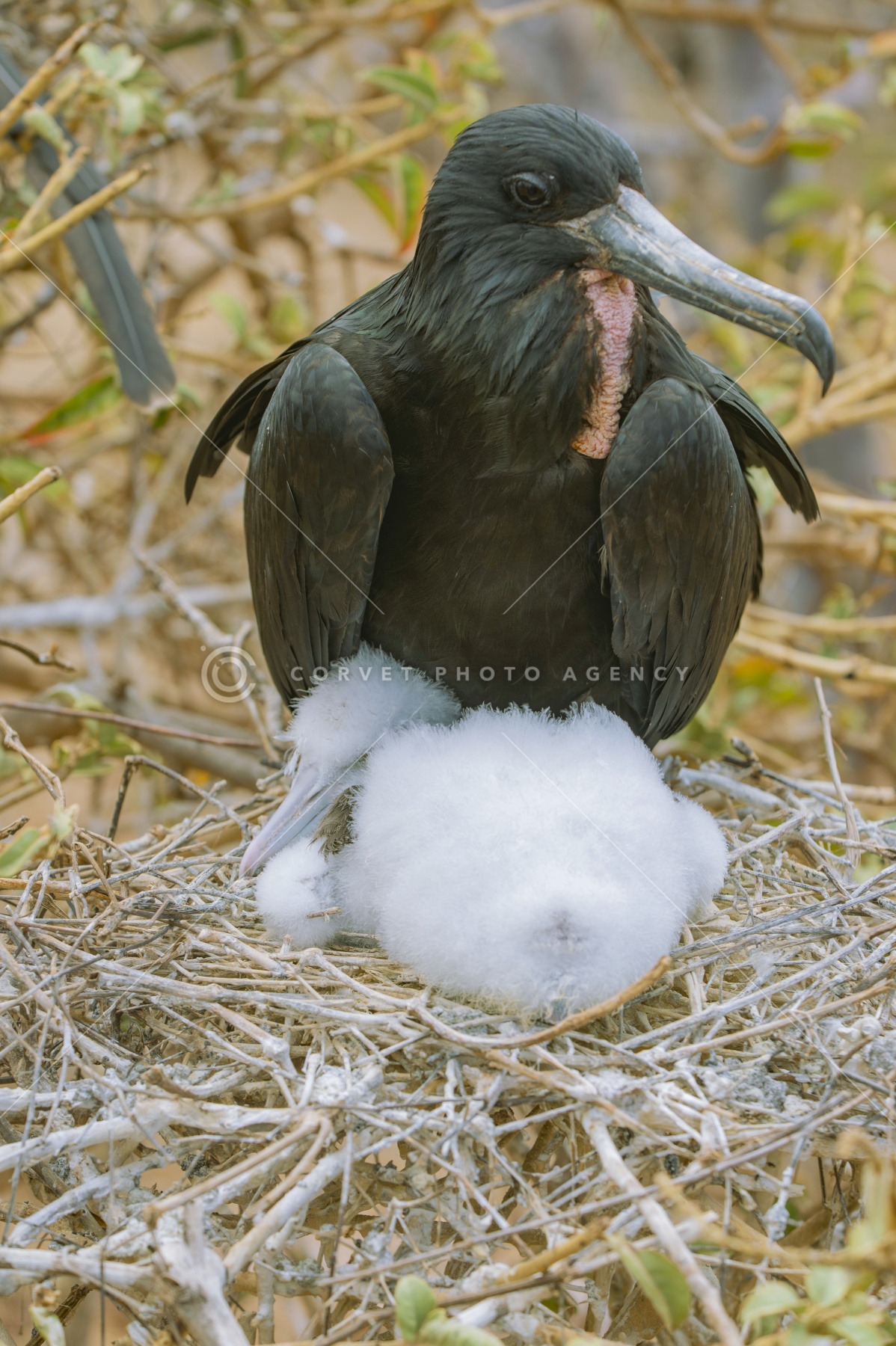 アメリカグンカンドリ 細い枝で作られた巣の上で、真っ黒なグンカンドリのオス(喉元に空気袋のしぼんだ跡がある)が全身真っ白な産毛の雛を守っていた。 エクアドル ガラパゴス諸島 2012年11月
