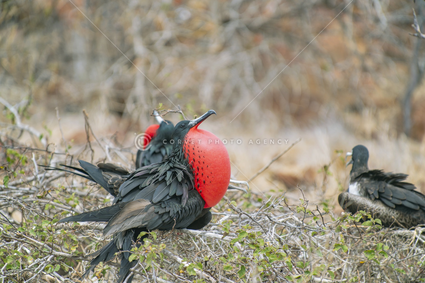 アメリカグンカンドリ 喉袋をパンパンに膨らませたオス。パンパンに膨らませた喉袋とこの美しい赤はメスにとっては魅力的に見えるのだろうエクアドル ガラパゴス諸島 2012年11月