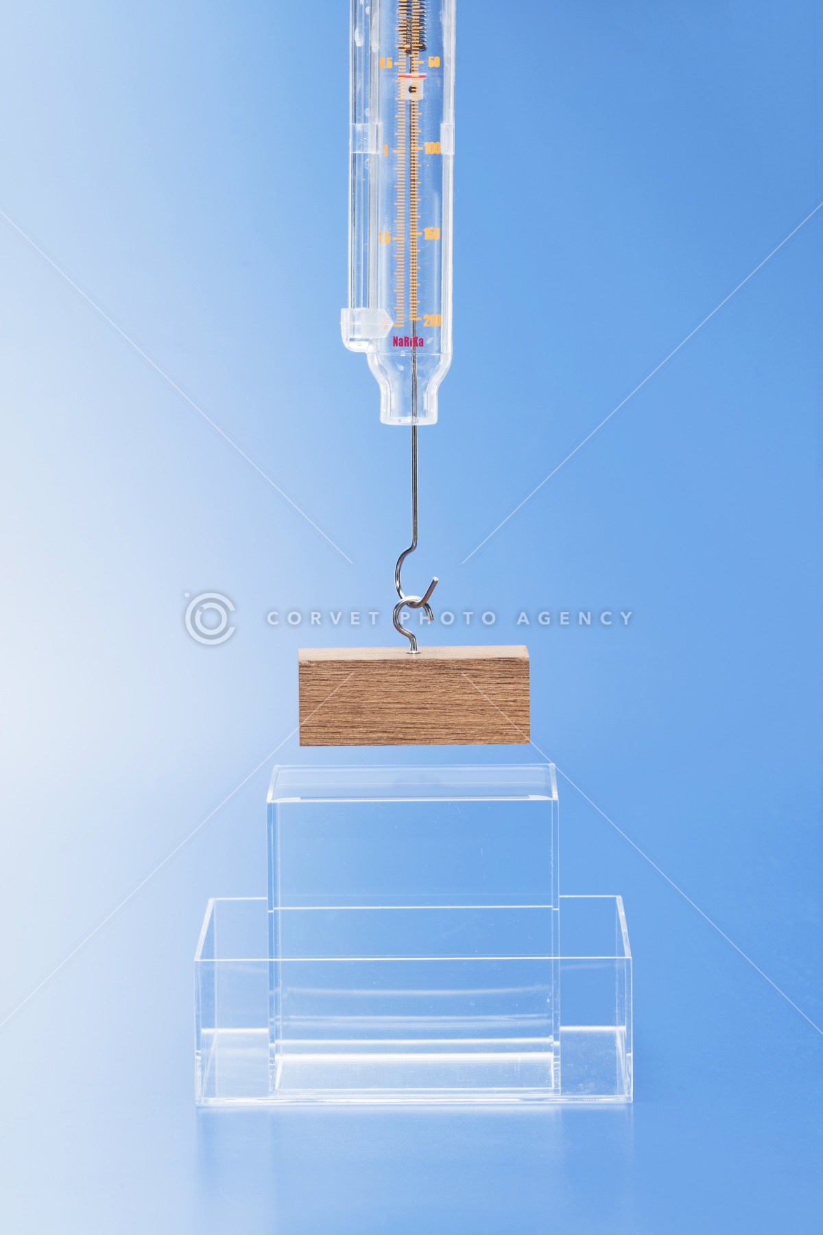 浮力 アクリルの水槽に水を入れる 200グラムの粘土と同じ大きさの木片(チーク) つりはかり58グラム