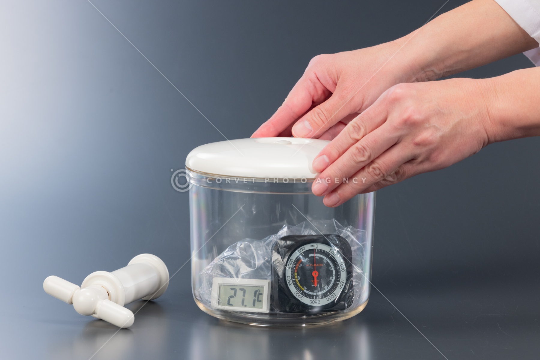 空気を膨張させる実験 気体の性質 断熱膨張 B_2 簡易真空容器に,ビニール袋に気圧計,デジタル温度計を入れる フタをする