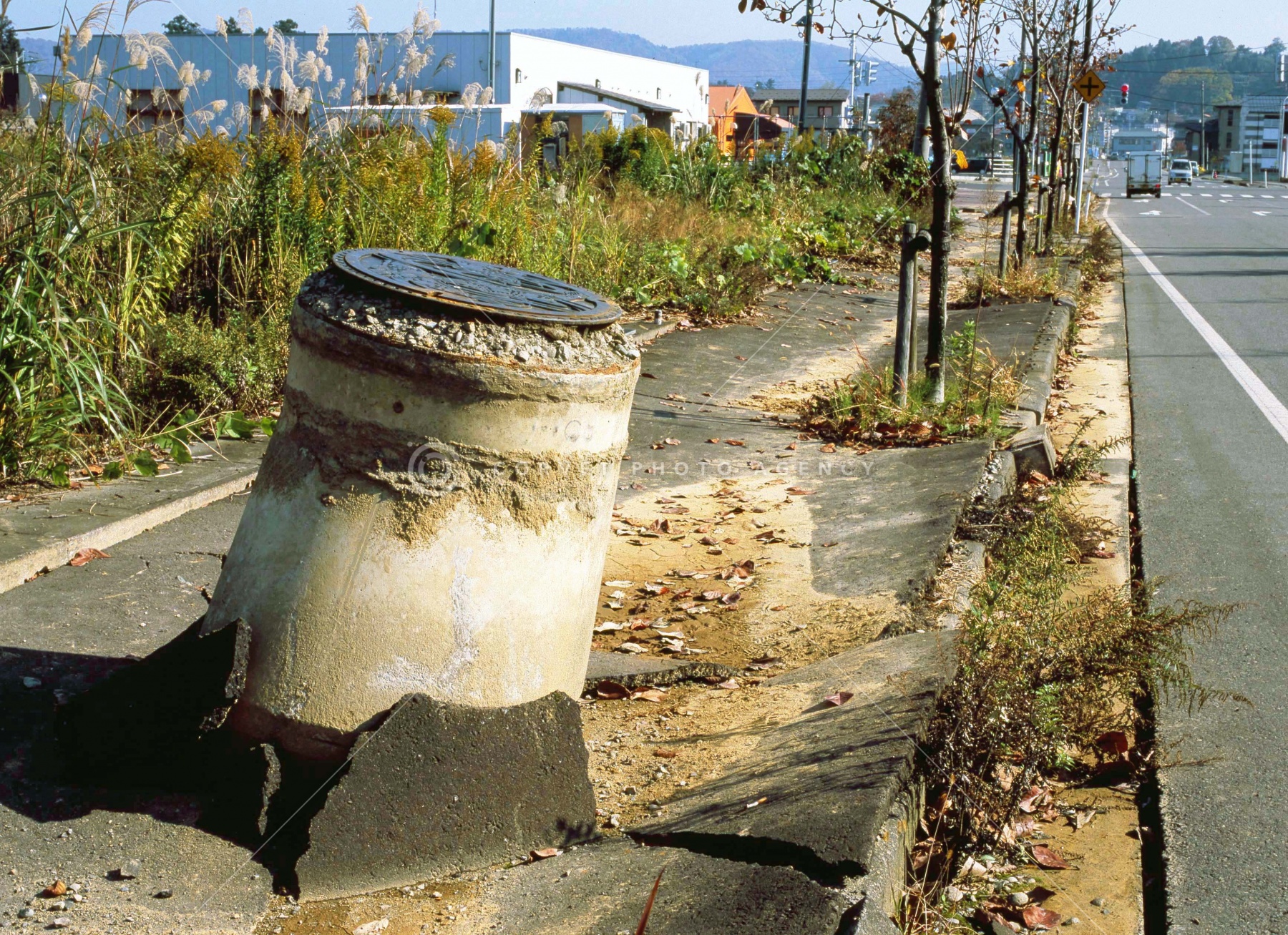 ※実際のご利用条件によって価格は変動いたします。新潟県中越地震 液状化した地盤から浮き上がったマンホール