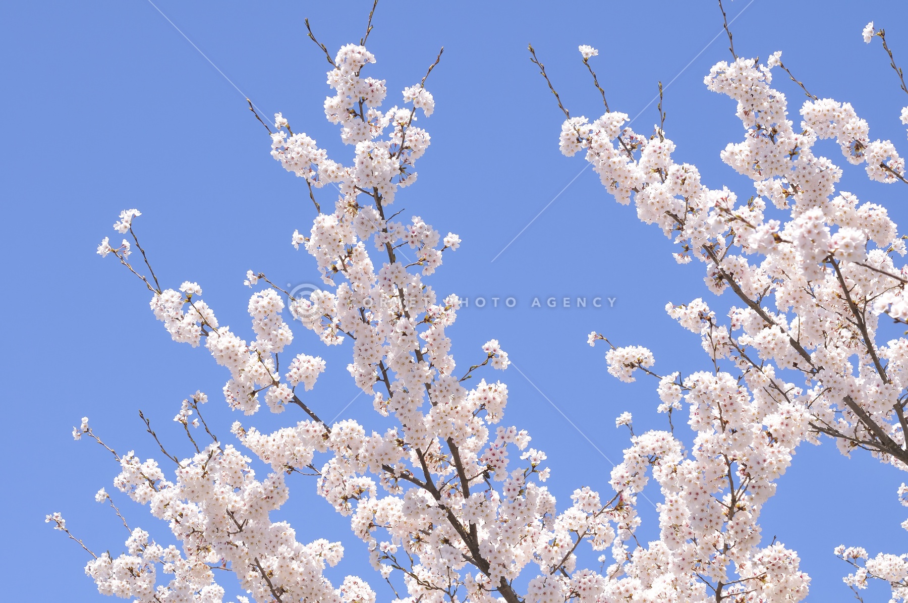 サクラの花が咲く様子 28-08 ソメイヨシノ 枝 花 満開 青空 Prunus X yedoensis cv.Yedonensis バラ科 長野県 佐久市 4月