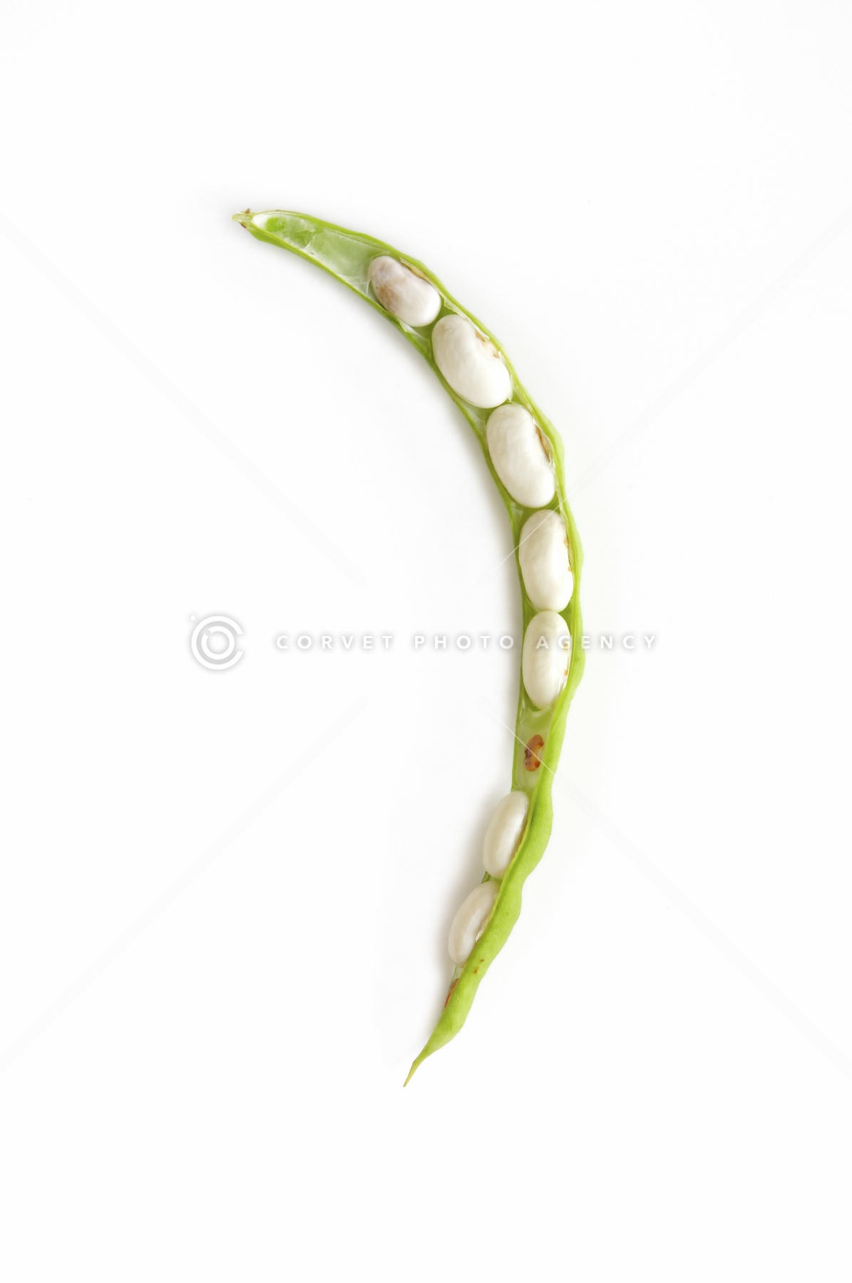 インゲンマメの果実 果実 豆果 未熟 中の様子 豆 Phaseolus vulgaris マメ科 長野県 佐久市 8月 白背景 スタジオ