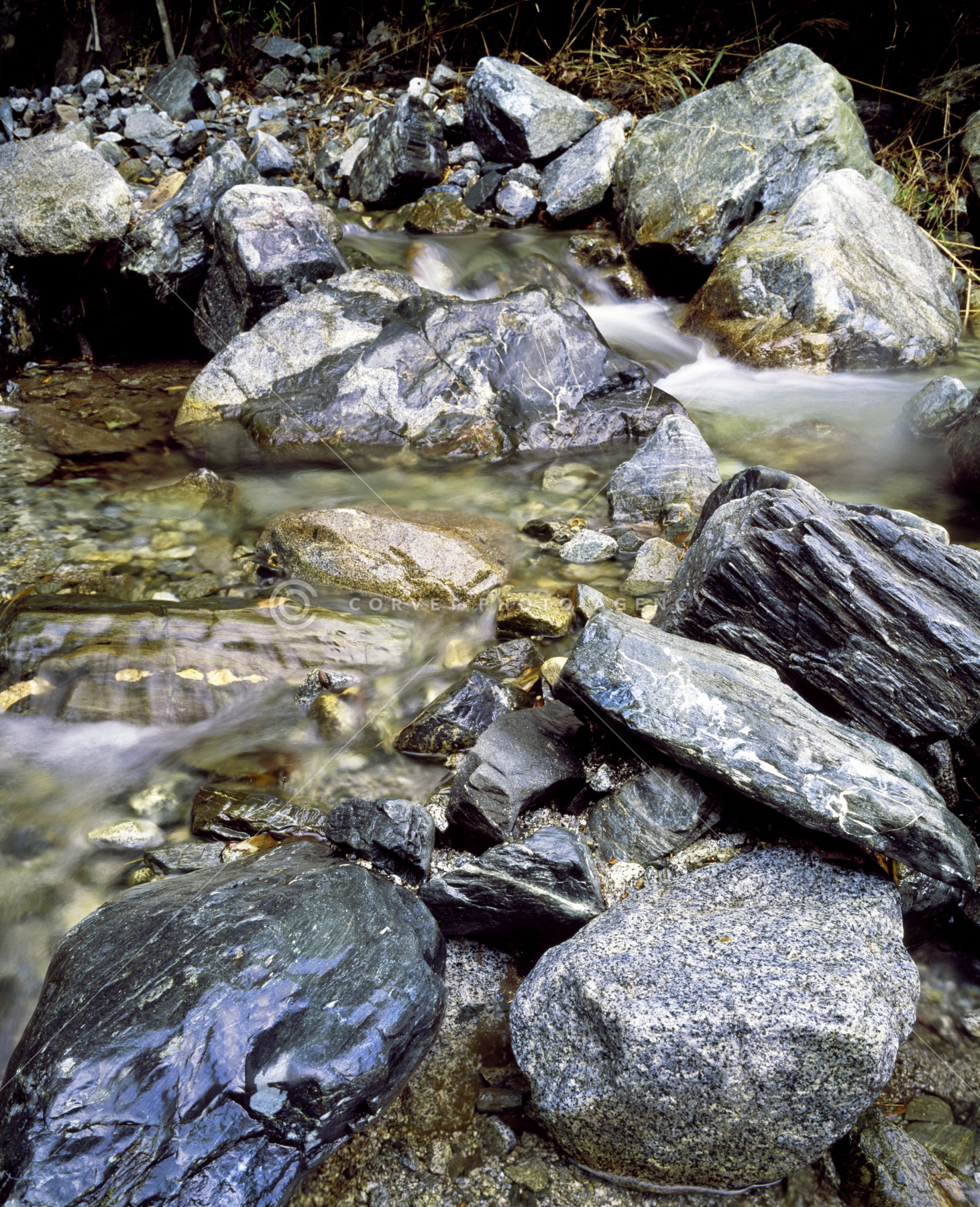 神奈川県 中川温泉 丹沢 結晶片岩 渓流に洗われているこの岩場は、層状をなしている岩石からできていて,層状とはいっても、通常の地層とは 異なり、折れ曲がったり、破砕を受け、ひきちぎられたりしています。岩石は白っぽいが、緑あるいは青みをおびるところもあり、全体として硬そうにみえます。写真は結晶片岩で、丹沢山地中央部を占めている石英閃緑岩の周りに形成されたものです。源岩はおもに玄武岩や安山岩および火山碎屑岩で、化石の産出は限られているものの、ここの大型有孔虫化石によれば時代は新第三紀中新世です。源岩のほとんどが火山噴出物であることから、丹沢山地もかつては海底火山として南方の海域にあったと考えられています。それはフィリピン海プレートに乗って本州 へ接合付加し、さらに地下にもちこまれて変成作用を受けその後、一〇〇万年前頃から火山群島の伊豆地塊が本州に衝突し、地下にあった丹沢の変成岩は石英閃緑岩とともに隆起して山地となり、浸蝕されました。 その結果生じた粗い堆積物が丹沢南部の厚い礫岩層をふくむ足柄層群です。