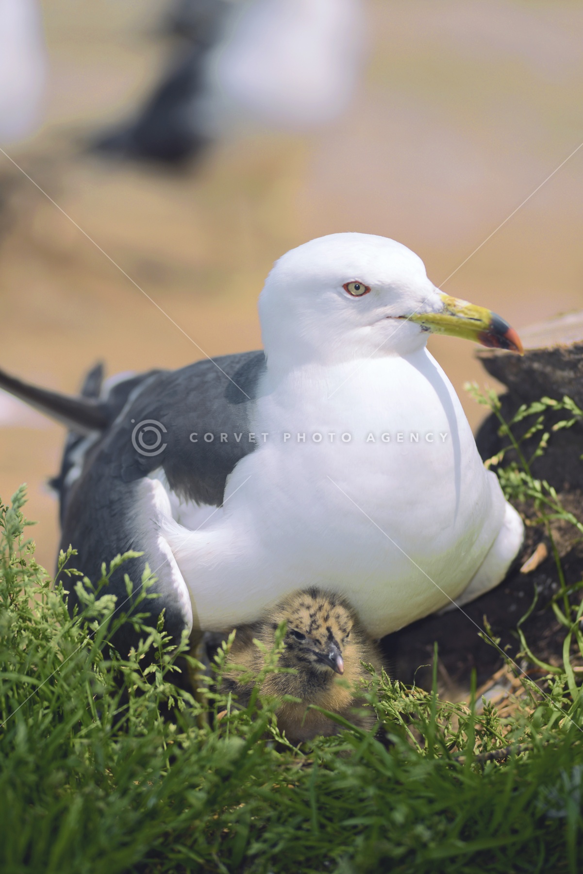 ウミネコ 親子 ヒナを抱く 青森県 八戸市 蕪島 5月