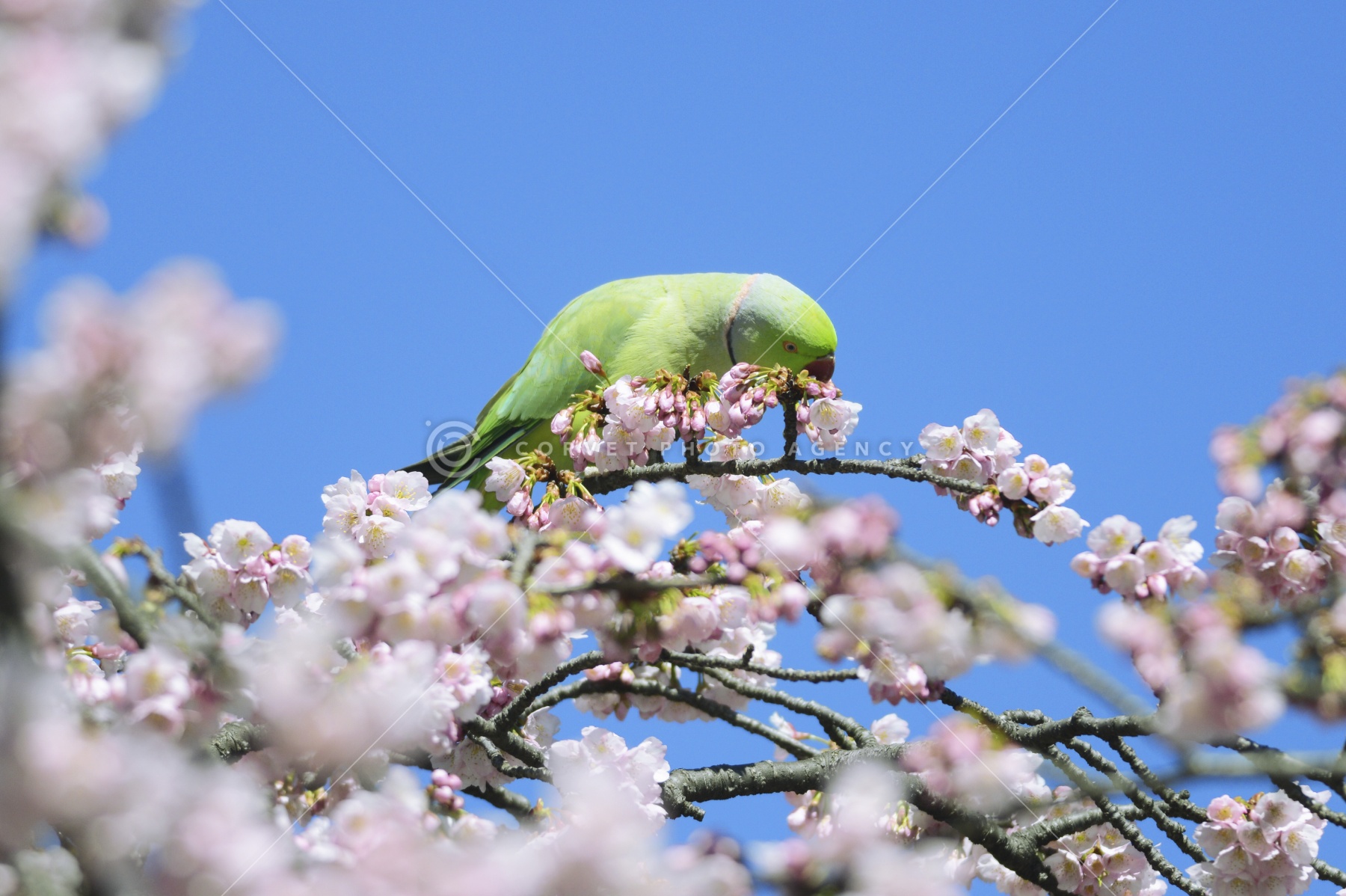 ワカケホンセイインコ オオカンザクラの花を食べる 東京都 台東区 上野公園 3月