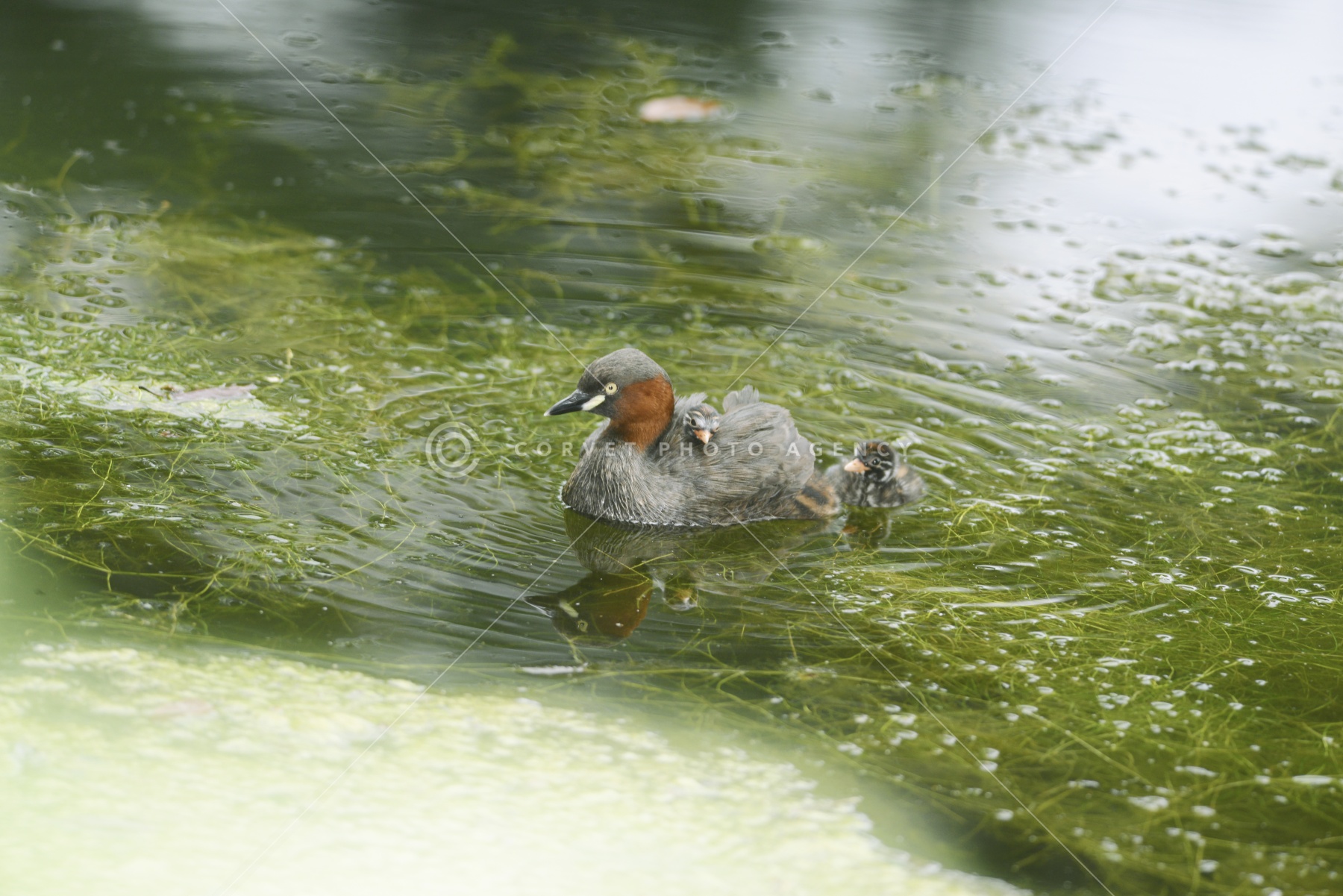 カイツブリ 親子 ヒナ一羽背負う 東京都 武蔵野市 井の頭公園 6月