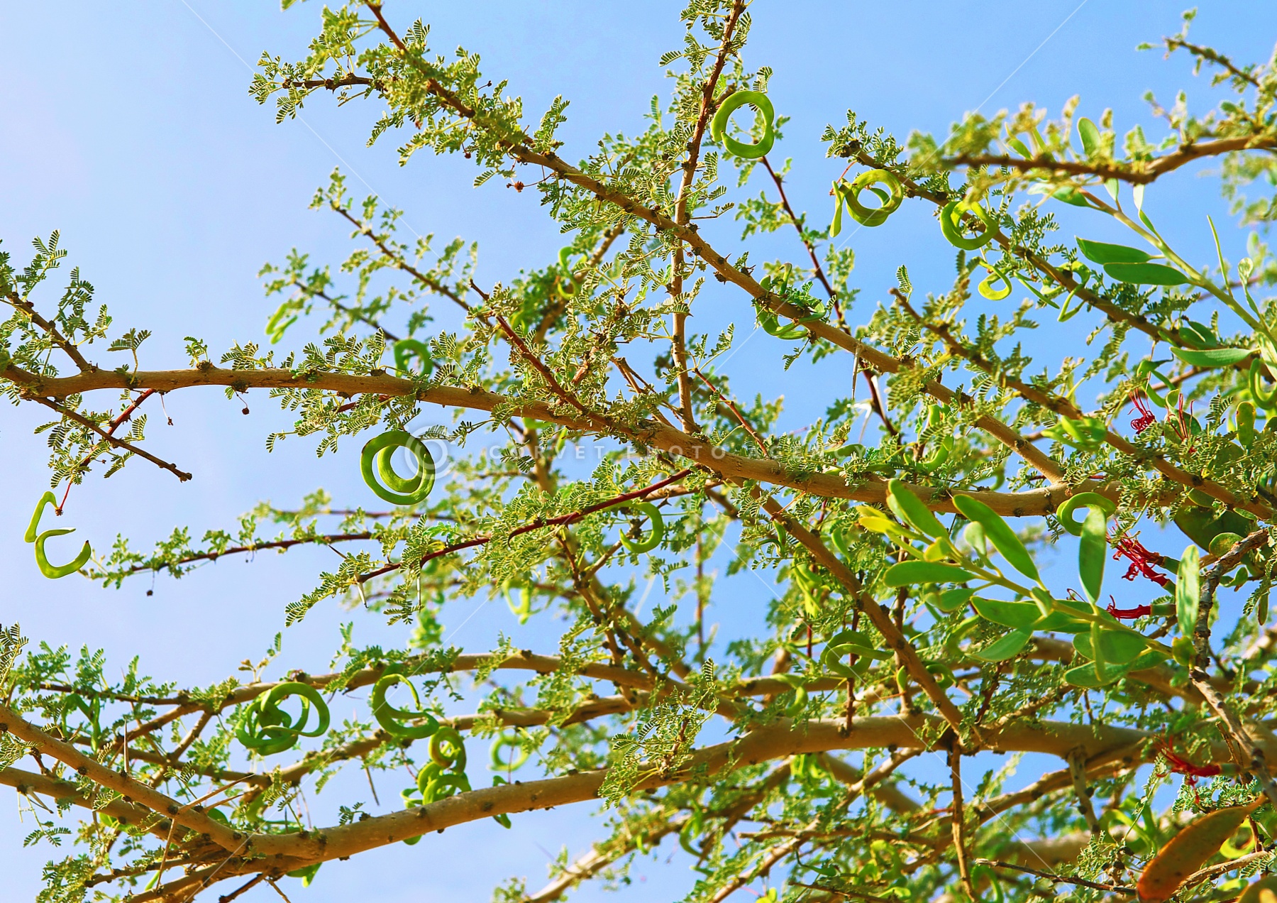 アカシア Acacia raddiana マメ科画面右に見える葉は寄生植物ロラントゥスアカシアエ。 イスラエル ネゲブ 3月