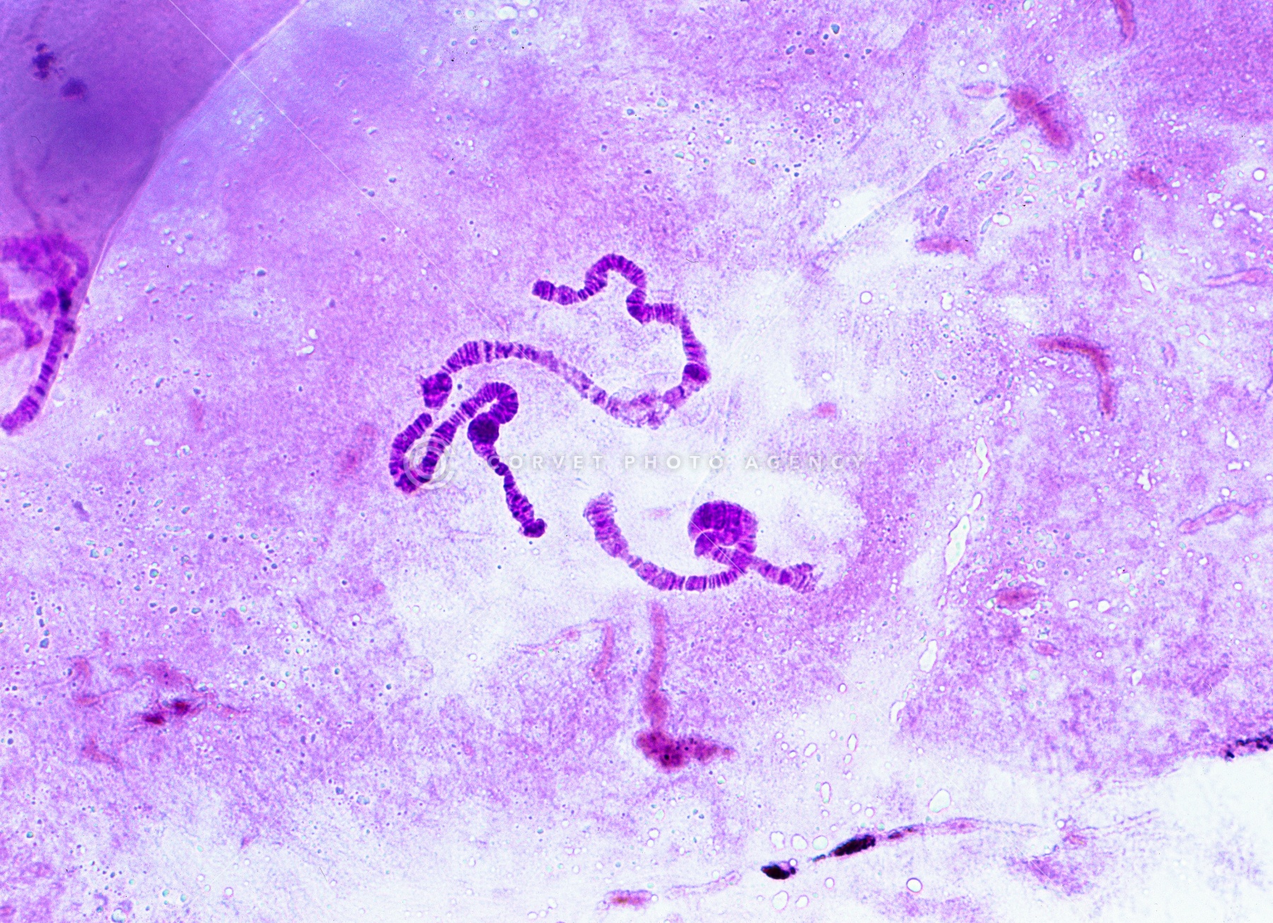 だ液腺染色体の観察 アカムシのだ液腺染色体 酢酸オルセイン染色 倍率160