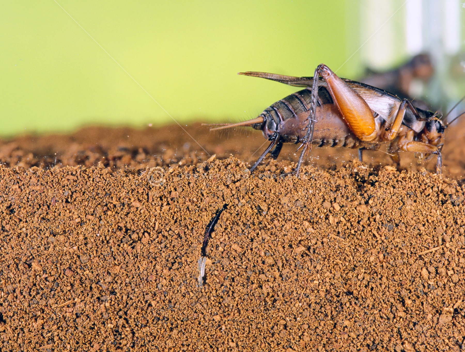 エンマコオロギ 雌 成虫 土に産卵管をさして産卵する雌と地中の卵 Gryllulus testaceus (=G. emma)コオロギ科 9月 神奈川県茅ヶ崎市