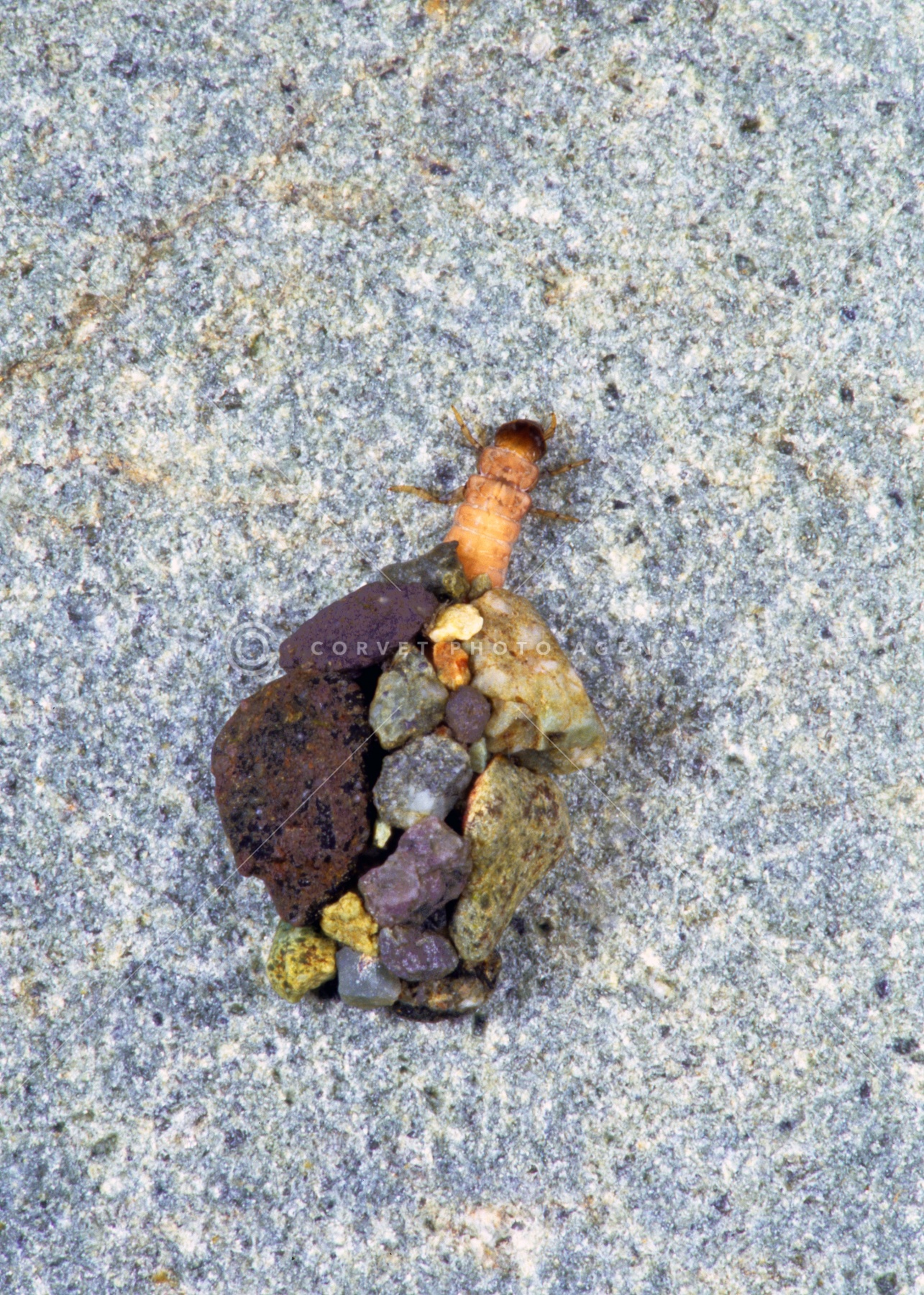 ヤマトビケラ類 幼虫 巣から体を出し石につかまる 川の水質の指標生物 きれいな水の指標 倍率2 4月 酒匂川水系 神奈川県 山北町