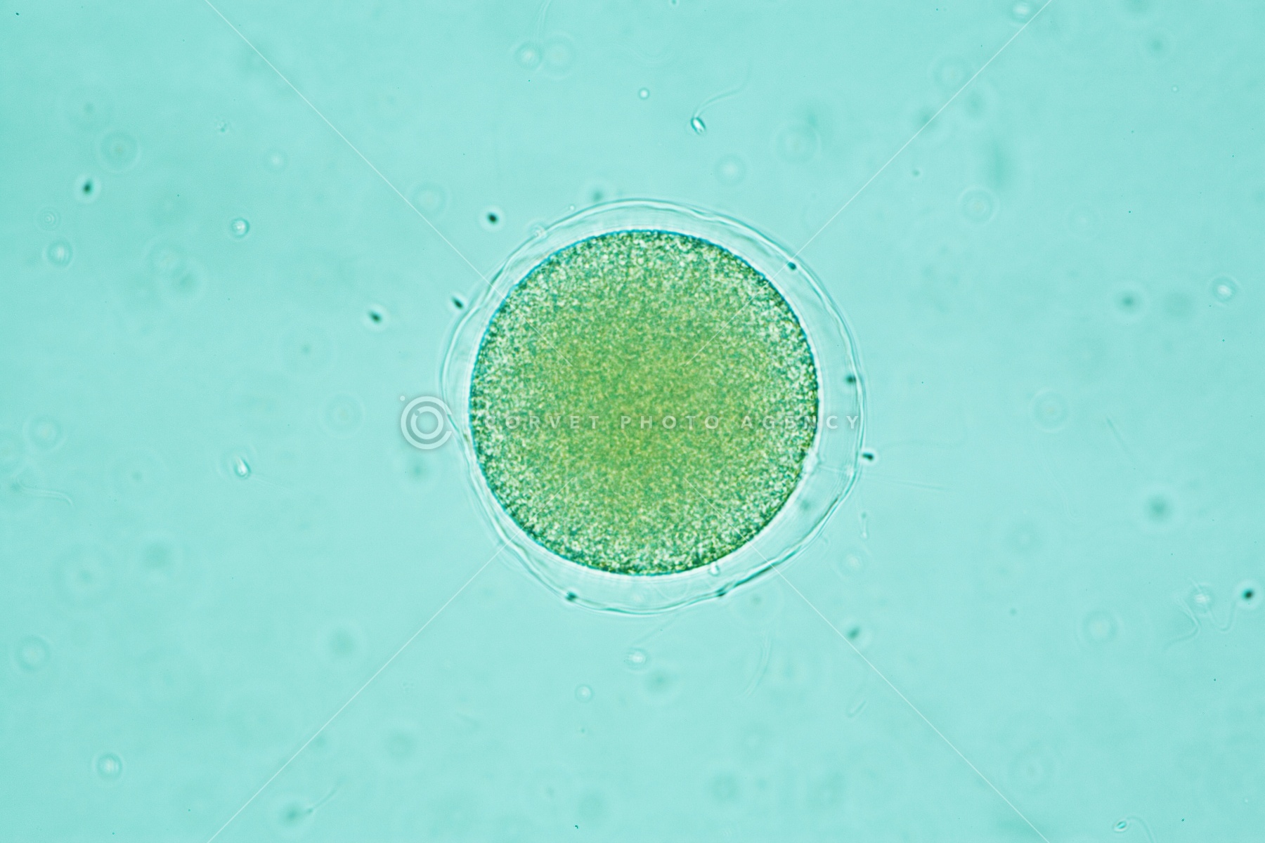 バフンウニの発生 Hemicentrotus pulcherrimus オオバフンウニ科 受精 右側から精子が侵入し受精丘(受精突起)ができる 神奈川県逗子市 3月 顕微鏡倍率40*1.25*PE2 画像の長辺0.35mm