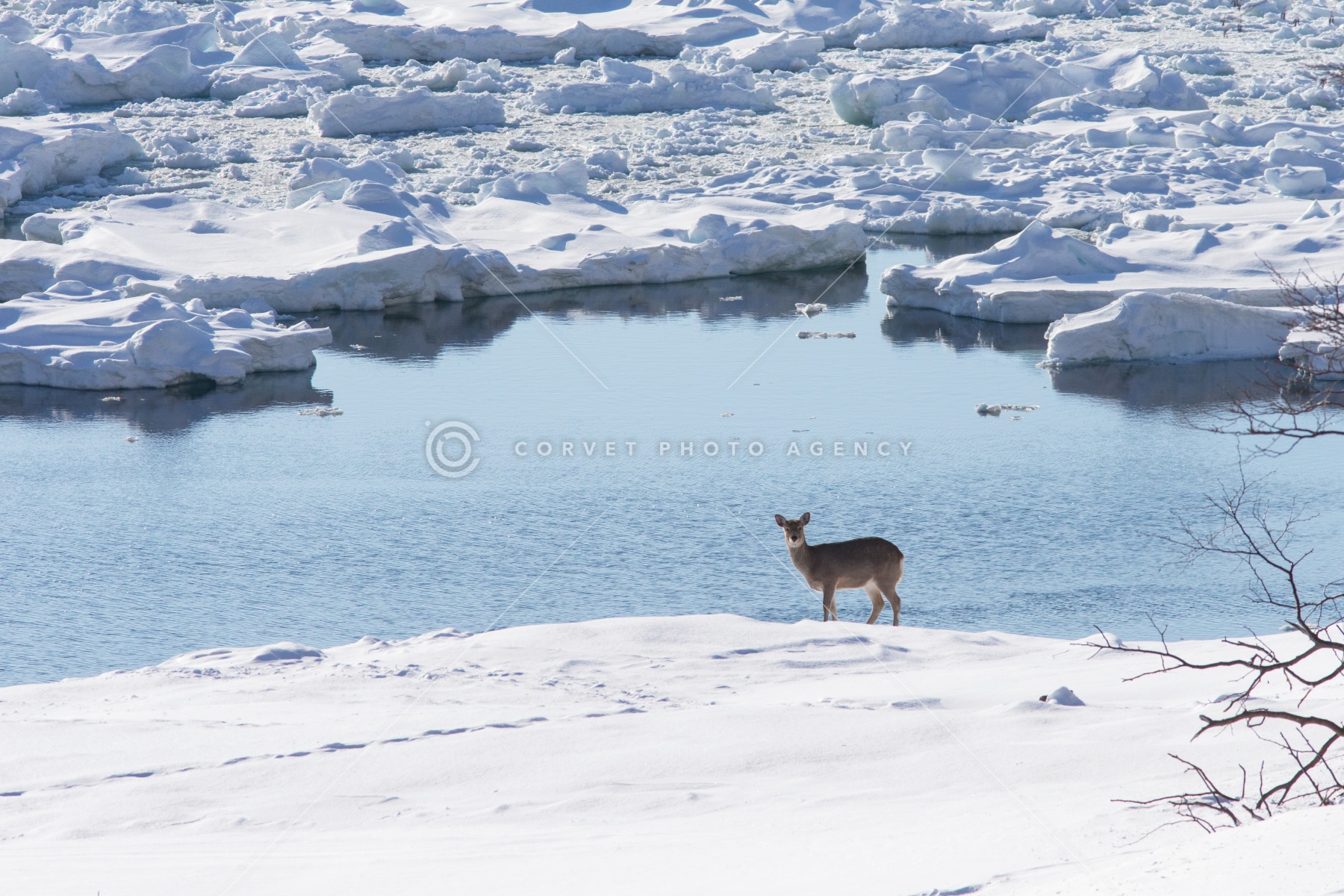 エゾシカ 海に流氷 Cervus nippon yesoensis ニホンジカ科 北海道  斜里町 3月