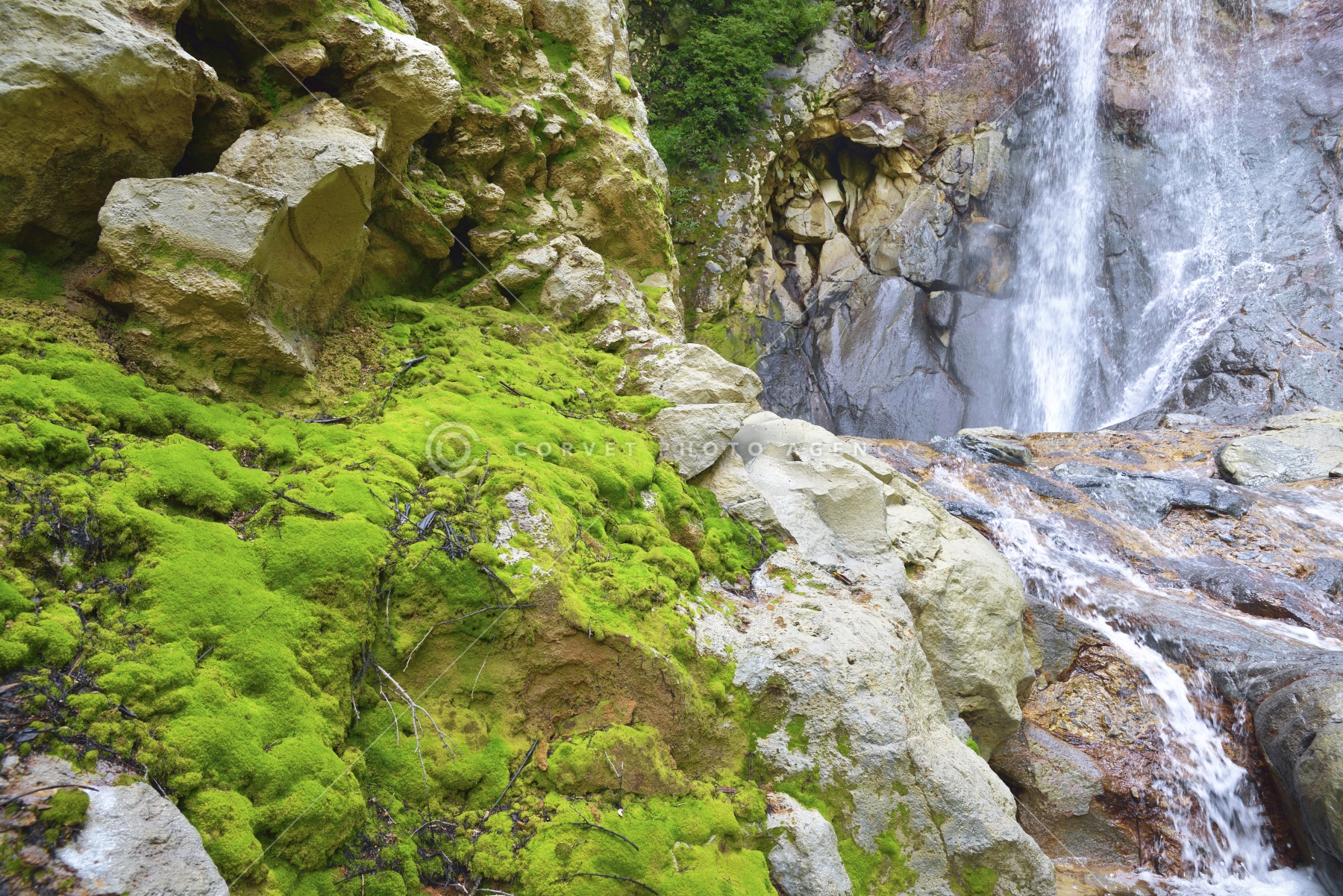 チャツボミゴケと滝 Jungermannia vulcanicola ツボミゴケ科 群馬県 草津町 2018年9月18日
